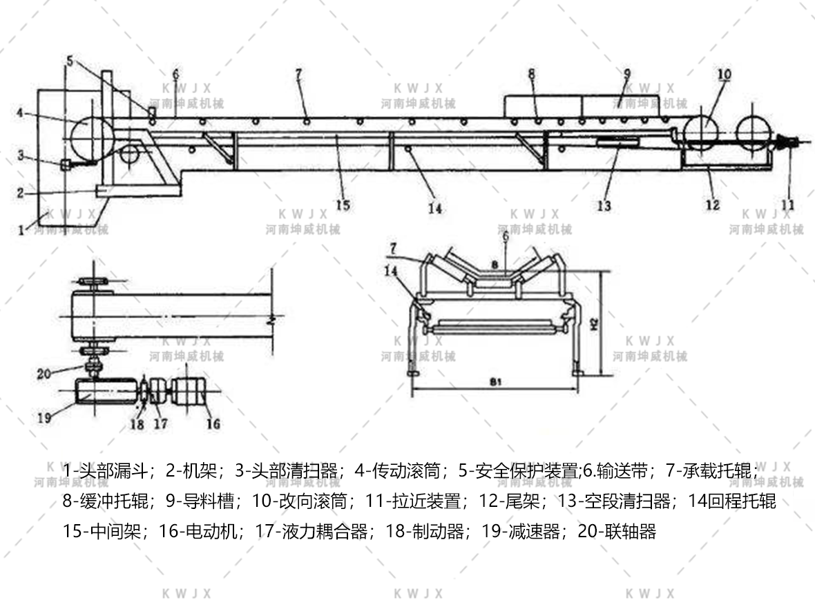 礦石皮帶輸送機(jī)主要組成部分包含:驅(qū)動(dòng)裝置(電動(dòng)滾筒/電機(jī)減速機(jī))、傳動(dòng)滾筒、中間架、頭架、尾架、改向滾筒、清掃裝置等等。如有特殊需求,也可根據(jù)客戶需要進(jìn)行特殊定制部件,例如:防護(hù)罩、漏斗等。