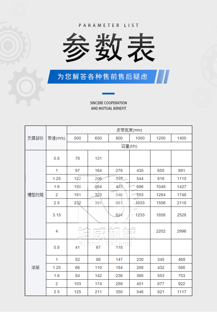 定貨時(shí)需注明:帶速、帶寬、輸送距離、輸送量、傾斜角度、物料特性、工作環(huán)境、堆積角度、皮帶材料等技術(shù)參數(shù)。